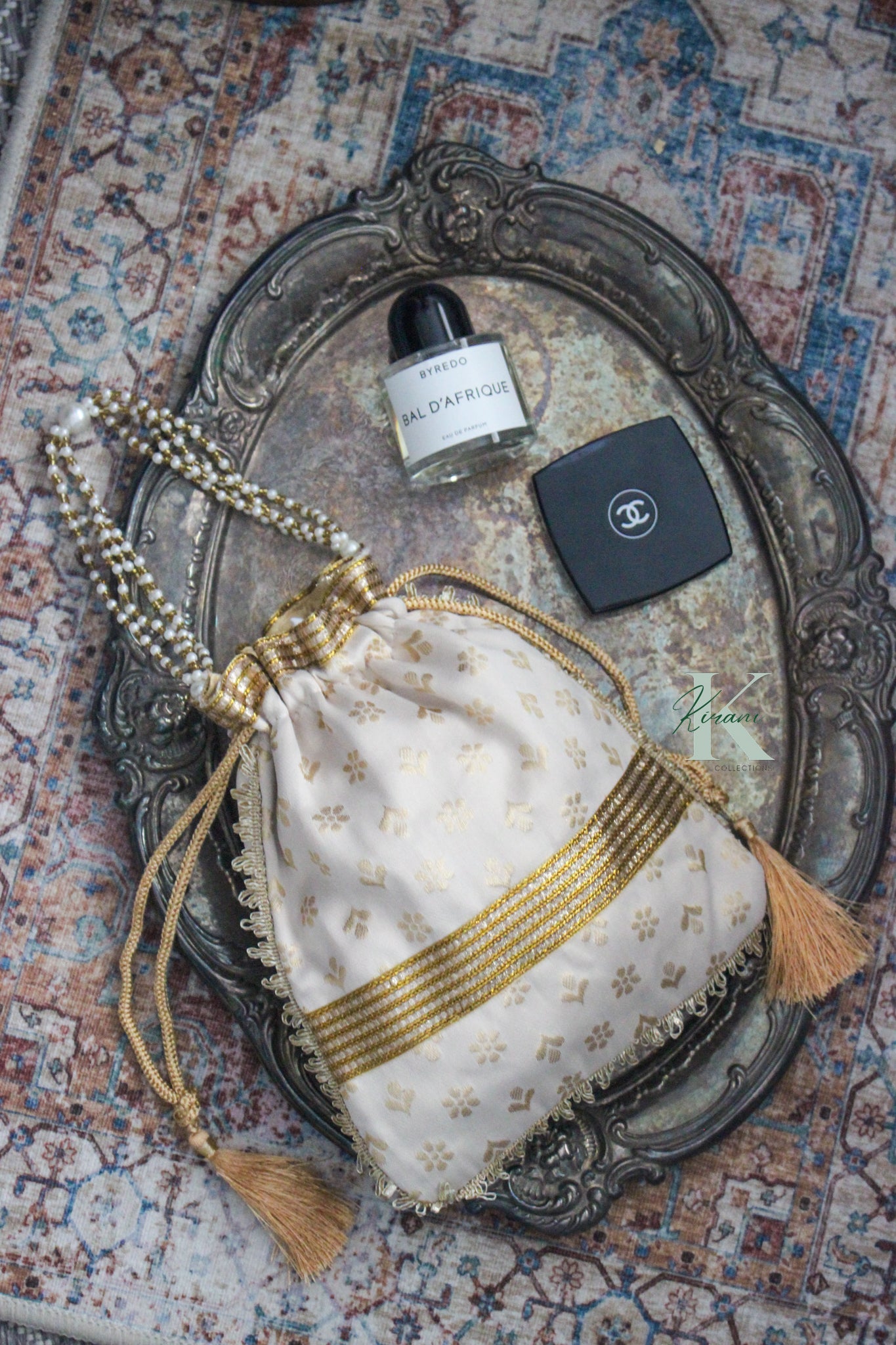 Embellish your look with our luxury Potli Bag, made of exquisite Indian fabric and finished with elegant gold accents. This chic bag can comfortably fit an iPhone Pro Max and a small wallet, allowing you to carry your items in style.