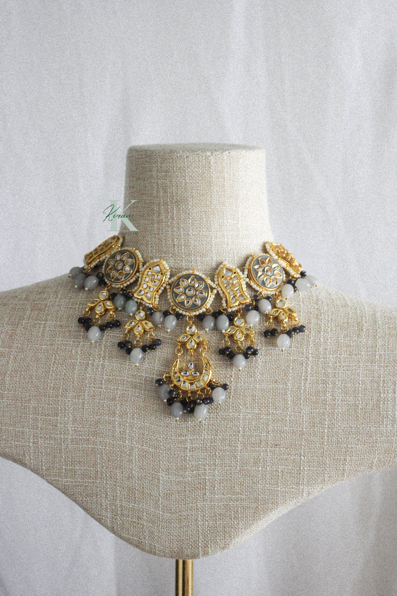 Delicate artistry meets modern elegance in the SUHANA Necklace Set. Featuring a soft grey color palette and intricate Meenakari detailing, this handcrafted set brings a refreshing twist to traditional jewelry. The beautiful enamel work is complemented by matching earrings, creating a graceful and balanced look.